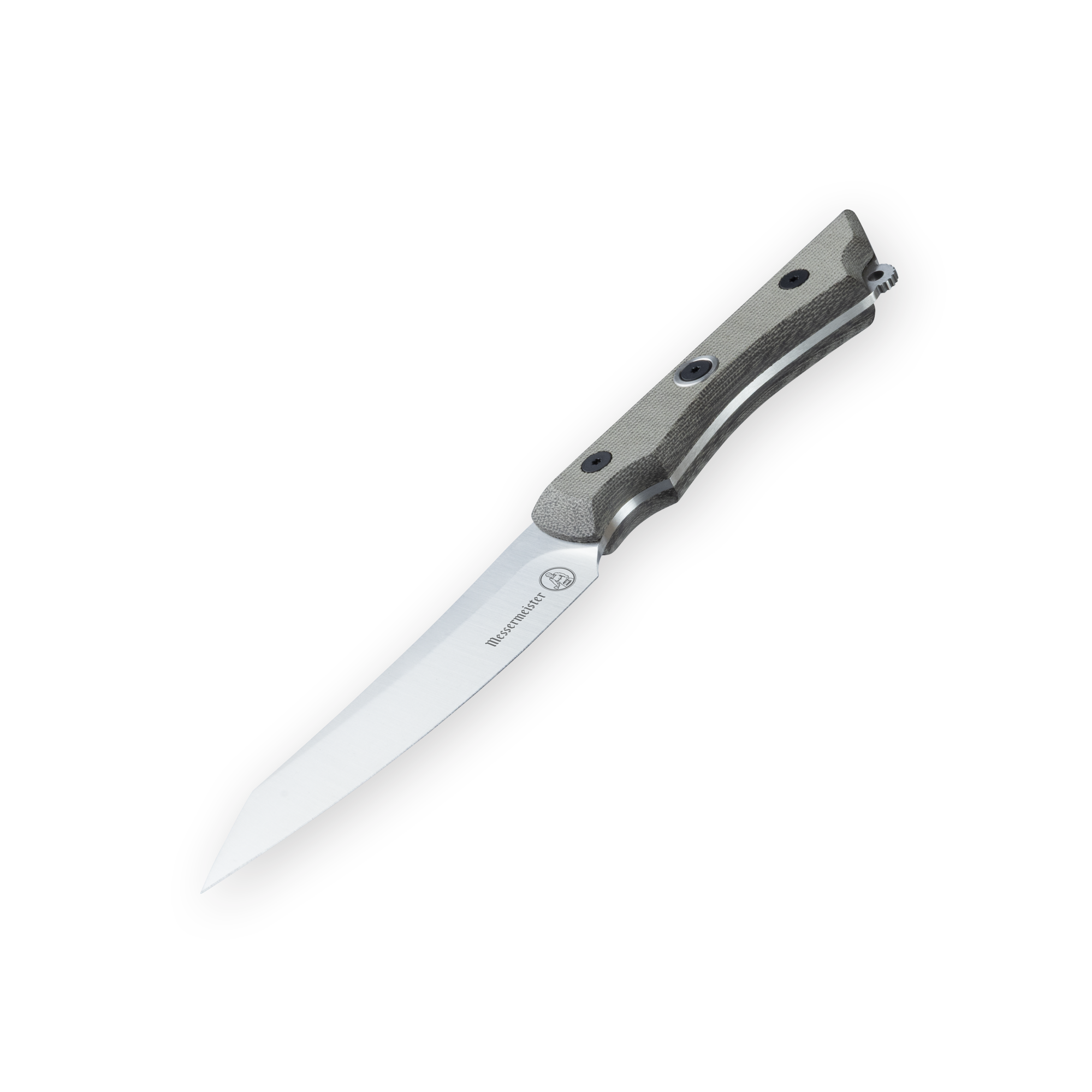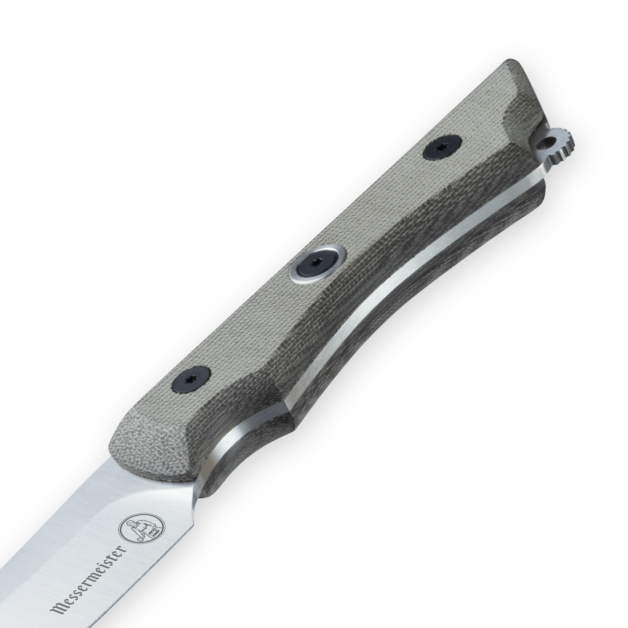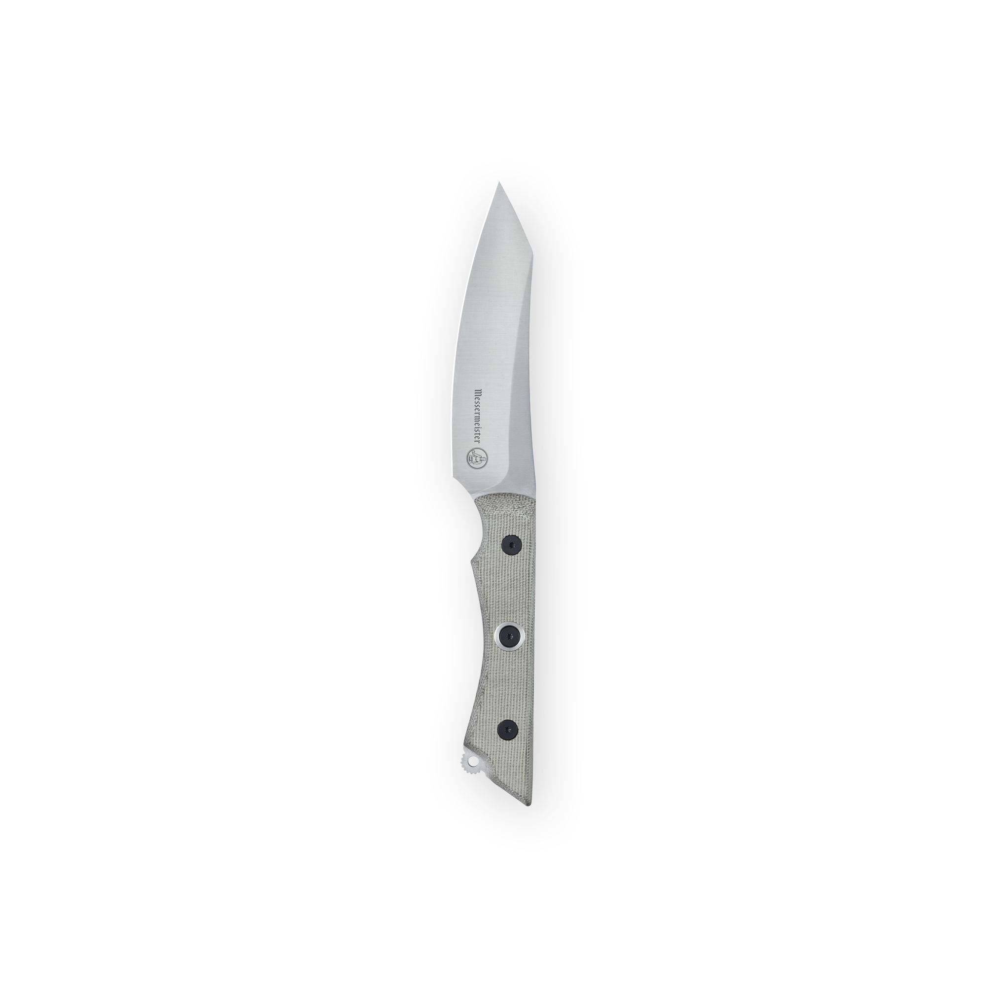 This is an amazing little but not so little knife. Ready for anything. I carry it all day on my campsite as a multi task EDC and as a chef I also use it in the kitchen and outdoor bbq for cooking. It’s sturdy and light at the same time. High quality materials. \nI love the blade with its rocking belly, Kiritsuke-like very pointy, precise and solid tip and the high flat grind on the whole blade length is so nice, plus it has a heel on the blade that you don’t get on classic camp knives, it’s the kitchen knife feature of this hybrid knife, it allows chopping and slicing food on a cutting board easily without smashing your fingers. The steel used, even if it’s stainless has a mat finish and a high carbon content that looks and feel great, it has a good edge retention and is easy to sharpen with the advantage of being more resistant to corrosion when used outdoors. \nThe handle is really nice too, very solid and comfortable and allows both pinching blade cooking grips and also different full hand grips like hammer grip or more precise carving grips. It doesn’t look tacky, that micarta gives it an already vintage look and also has a really stylish shape. Possibility to change or customize the handle scales on the knife’s full tang with the screws rivets is a plus. \nThe sheath fits perfectly and is easy to wear on a belt. Very nice look over all and beautiful thick leather. \nI own and collect a lot of knives and this one has been the nicest surprise I had in a long time. \nHighly recommend! It’s a hidden gem on the market for a reasonable price.